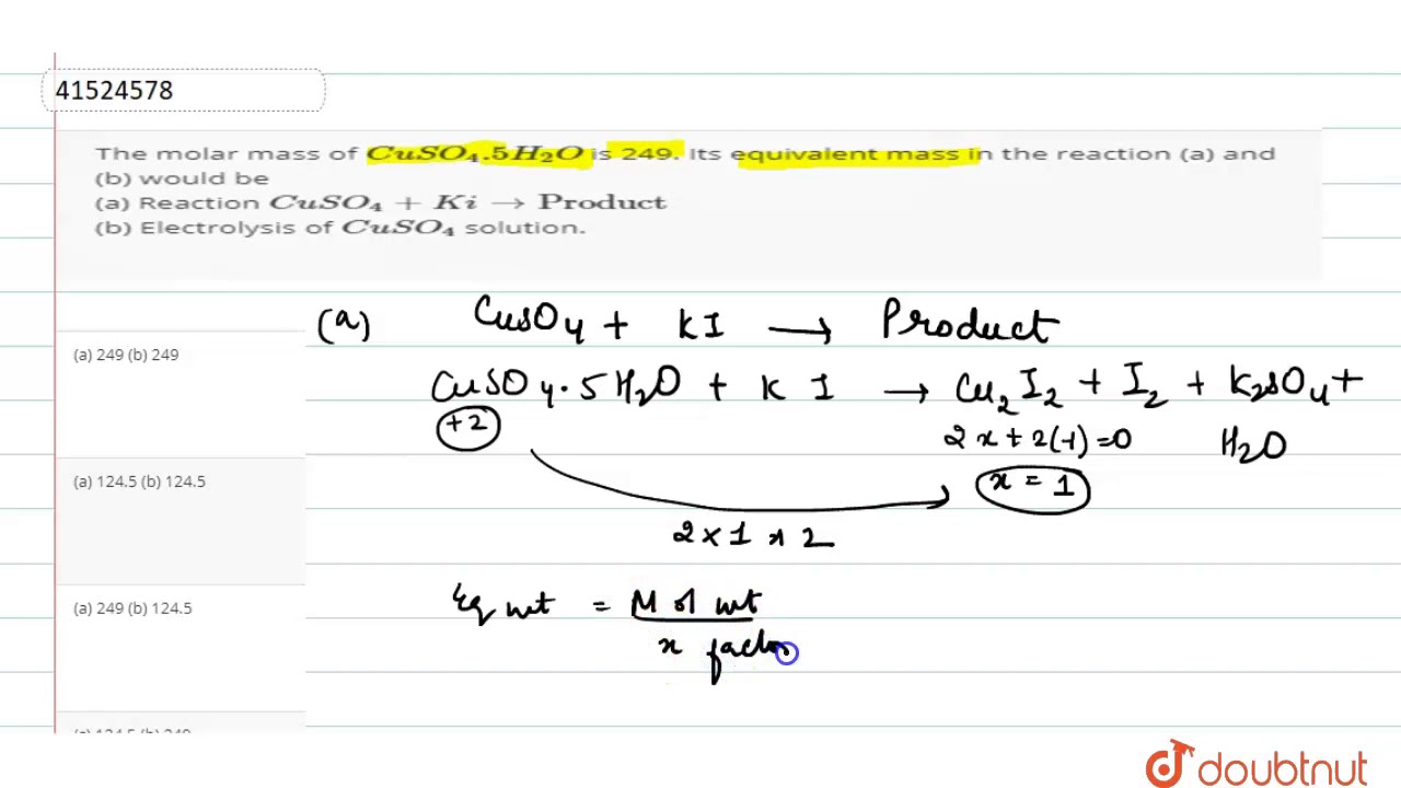 The Molar Mass Of Cuso 4 5h 2 O Is 249 Its Equivalent Mass In The Reaction A And B Youtube